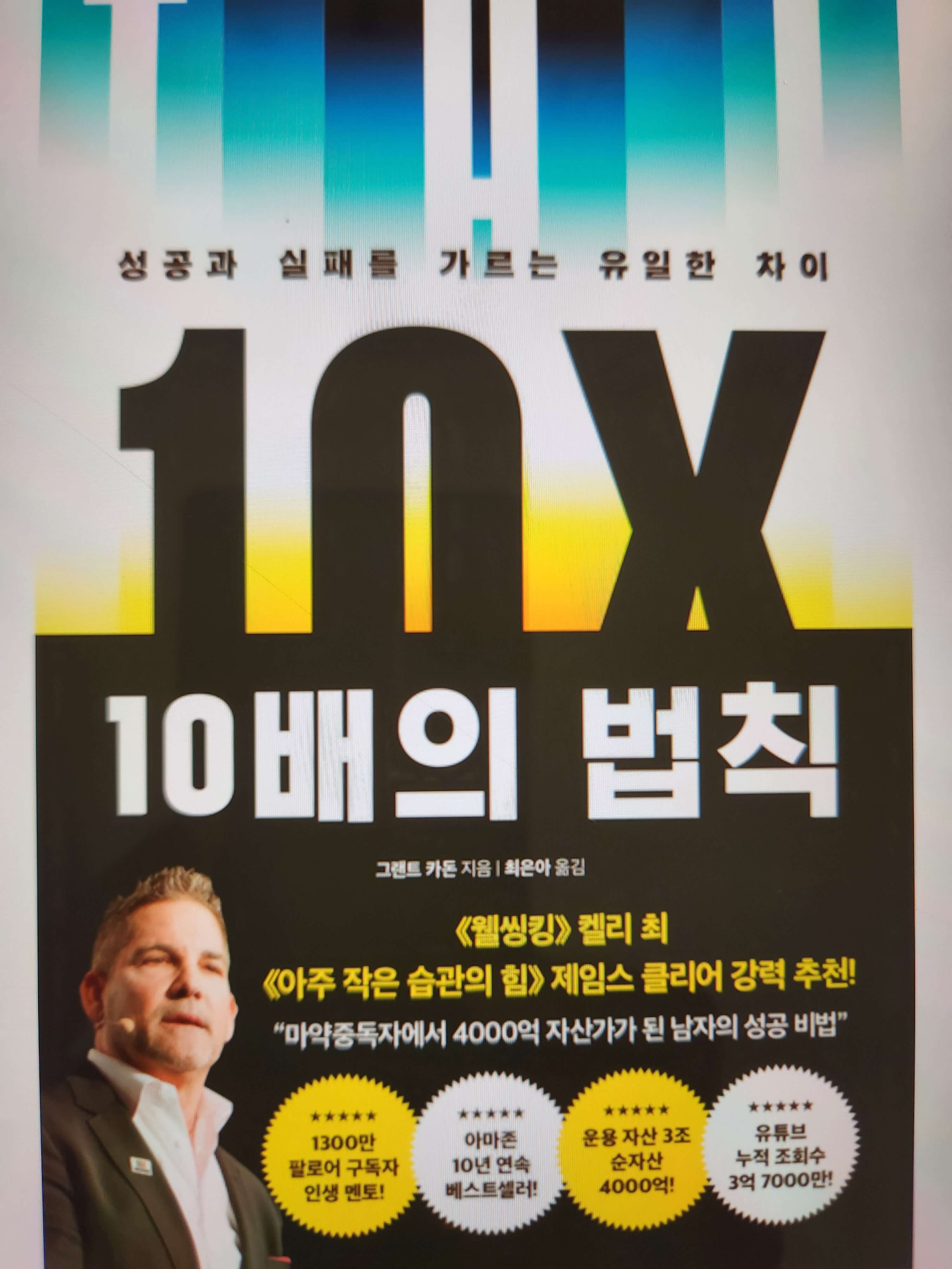 그랜트 카돈이 쓴 '10배의 법칙'은 2022년 3월 출간되었으며 펴낸 곳은 부키(주)이다. '성공과 실패를 가르는 유일한 차이'라는 부제를 가진 이 책은 표지에서도 말하고 있지만 <웰씽킹>을 쓴 세계적인 부호 켈리 최 회장이 강력 추천을 한 책이다. 켈리 최 회장이 운영하는 유튜브에도 저자를 자주 인터뷰하는 것을 본 적이 있다. 개인적으로 켈리최 회장만큼이나 열정적인 사람이라는 느낌을 받았다. 오늘은 그가 쓴 이 책에 대해서 저자 소개, 주요 내용, 추천 이유 순으로 이야기해보고자 한다.