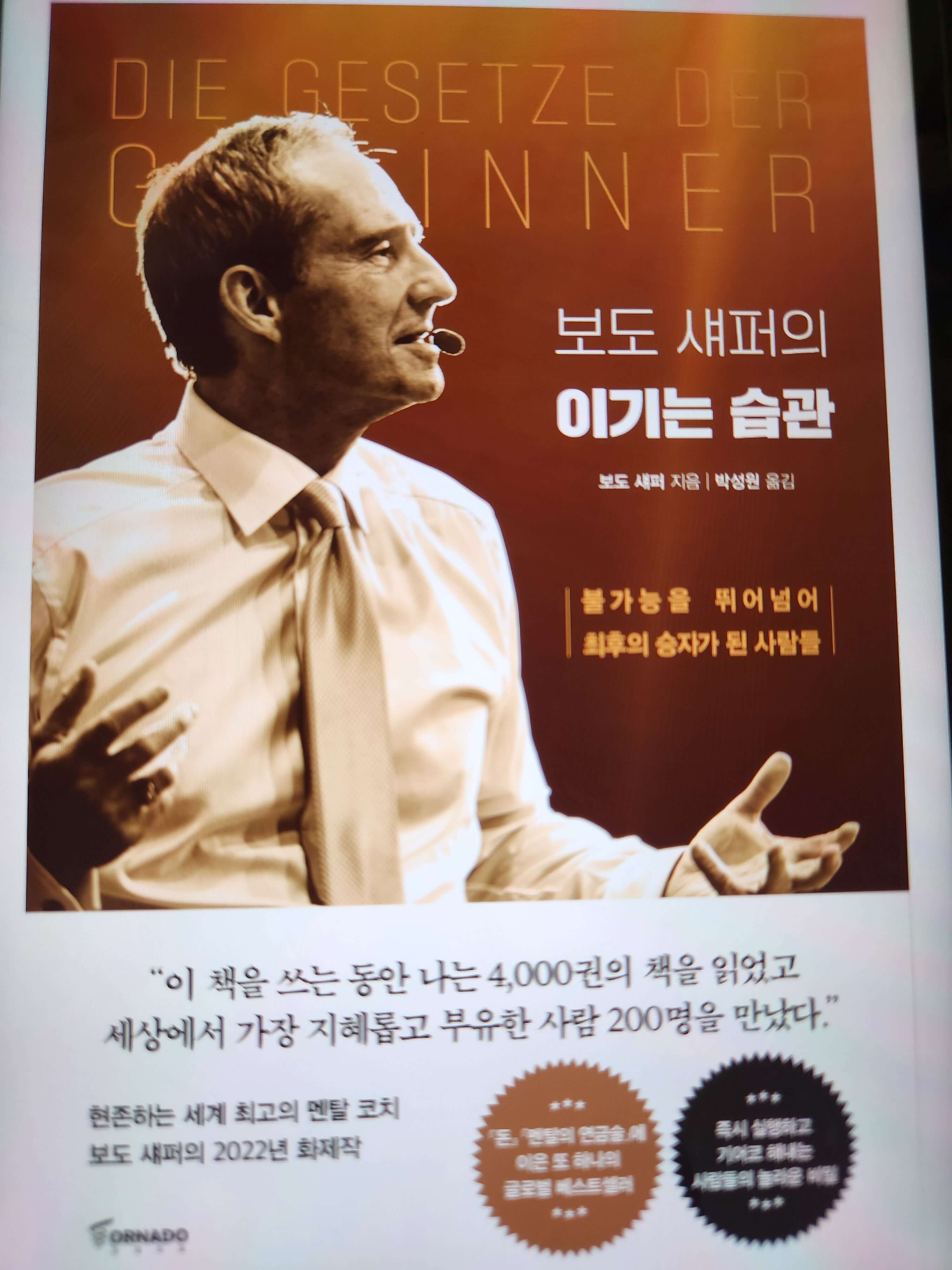 보도 셰퍼의 이기는 습관은 2022년 3월 출간되었고 펴낸 곳은 토네이도미디어그룹(주)이다. '불가능을 뛰어넘어 최후의 승자가 된 사람들'이란 부제를 가지고 있는 이 책은 현존하는 세계 최고의 멘털 코치라는 평가처럼 책의 모든 구절구절이 강한 동기부여와 마음 치유의 역할을 하고 있다. 뛰어난 삶의 지혜에서 우러나오는 귀한 조언들이 삶의 모든 면을 발전시키는 느낌을 받게 된다. 오늘은 이 책에 대해서 저자 소개, 주요 내용, 추천 이유의 순으로 이야기해보고자 한다.